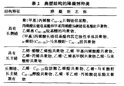 ② 降凝劑的分子結(jié)構(gòu)由長鏈烷基基團(tuán)和極性基團(tuán)兩部分組成,長鏈烷基結(jié)構(gòu)可以在側(cè)鏈上,也可以在主鏈上,或者兩者兼有(如表)。